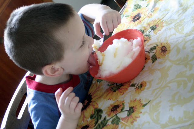 When Tobin and Shav were chilly and ready to come inside, they weren't ready, however, to stop eating the cold whiteness.  That wasn't a problem though, because I could find enough clean snow to scoop into a bowl for them and then--just for fun--put some honey on top like Tobin requested.